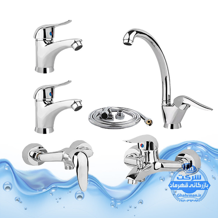 ست ۶ عددی شیرآلات مدل دنیز | شیر ظرفشویی + ۲ عدد روشویی + حمام + توالت + شلنگ توالت | کروم براق