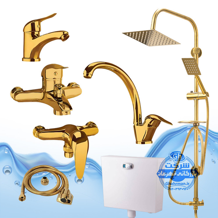 ست ۷ عددی شیرآلات برند آیدا صنعت مدل دنیز | طلایی براق | علم دوش صفحه استیل