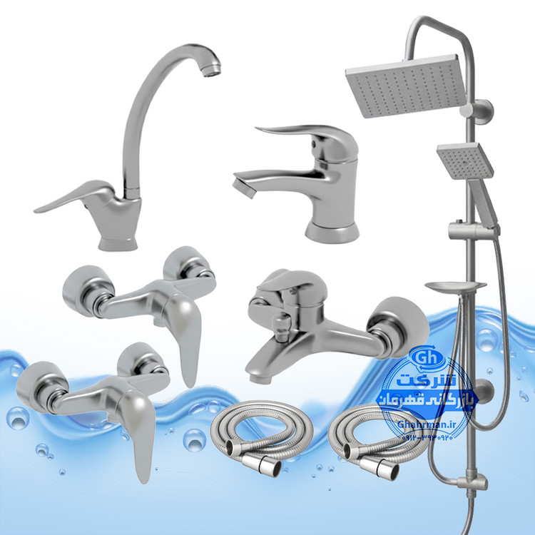 ست ۸ عددی شیرآلات برند آیدا صنعت مدل دنیز | شیر ظرفشویی + روشویی + حمام + دو عدد توالت + علم دوش یونیورست صفحه استیل رسوب‌گیر اتومات + دو شلنگ توالت | کروم مات