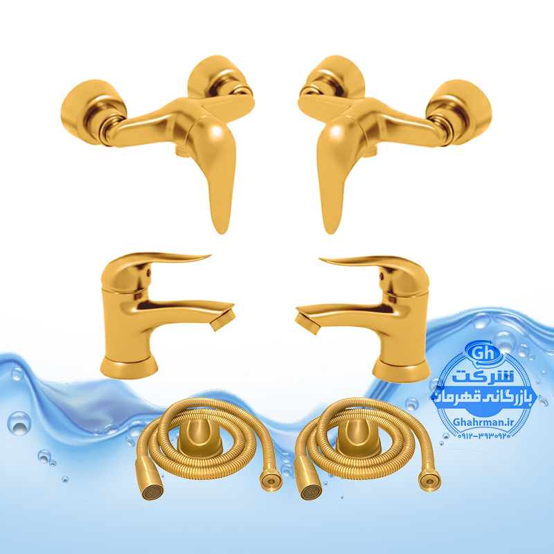 ست ۶ عددی شیرآلات مدل دنیز | ۲ عدد شیر روشویی + ۲ عدد شیر توالت + ۲ عدد شلنگ توالت | طلایی مات