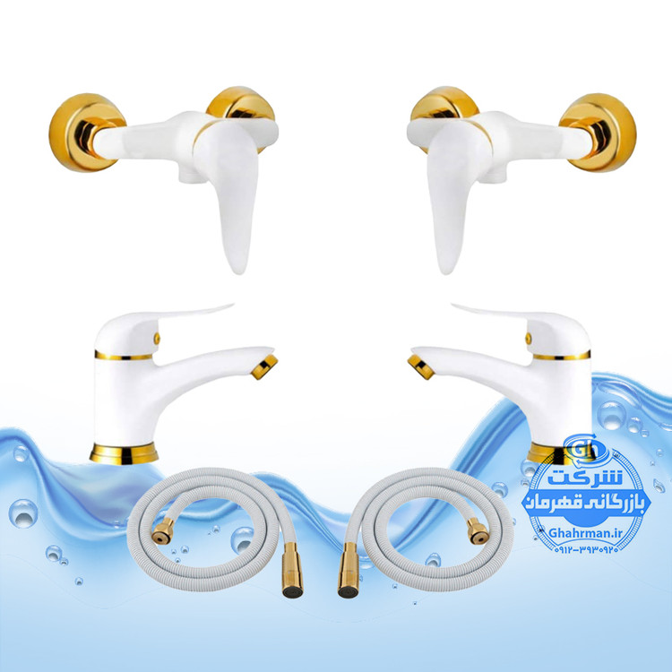 ست ۶ عددی شیرآلات مدل دنیز | ۲ عدد شیر روشویی + ۲ عدد شیر توالت + ۲ عدد شلنگ توالت | سفید طلایی