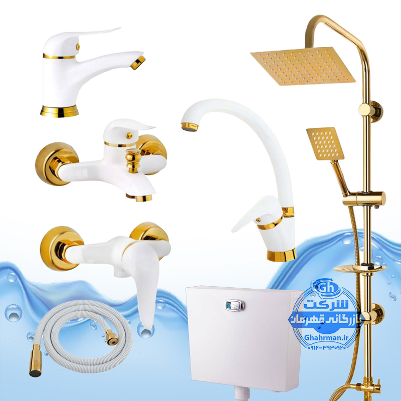 ست ۷ عددی شیرآلات برند آیدا صنعت مدل دنیز | سفید طلایی | علم دوش صفحه استیل