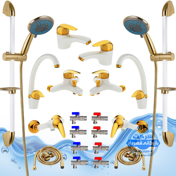 ست ۲۰ عددی شیرآلات برند آیدا صنعت مدل قهرمان اردکی | دو عدد شیر ظرفشویی + دو عدد شیر روشویی + دو عدد شیر حمام + دو عدد شیر توالت + دو عدد علم دوش یونیورست مدل یونیکا کروم + دو عدد شلنگ توالت + دو عدد شلنگ استیل + هشت عدد شیر پیسوار | سفید طلایی