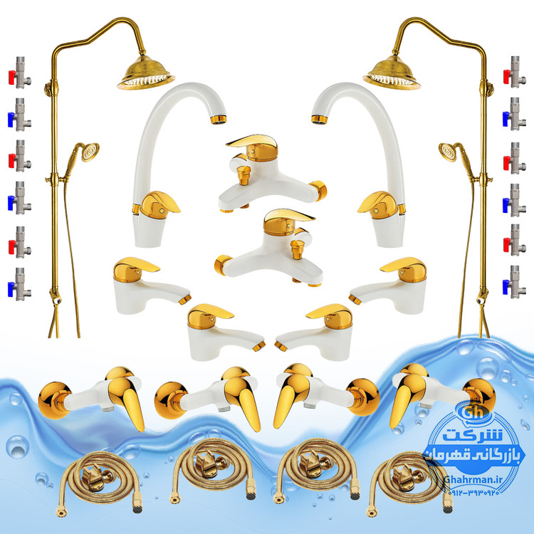 ست ۳۰ عددی شیرآلات برند آیدا صنعت مدل قهرمان اردکی | سه عدد شیر ظرفشویی + سه عدد شیر روشویی + سه عدد شیر حمام + سه عدد شیر توالت + سه عدد علم دوش یونیورست مدل شیپوری کروم + سه عدد شلنگ توالت + سه عدد شلنگ استیل + دوازده عدد شیر پیسوار | سفید طلایی