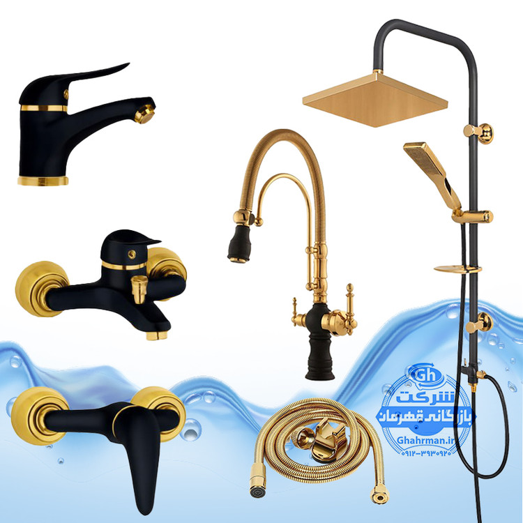 ست ۶ عددی شیرآلات مدل دنیز | شیر ظرفشویی دومنظوره کلاسیک فنری بیزانس + شیر روشویی + حمام + توالت + شلنگ توالت + علم دوش اتومات مربع | مشکی طلایی